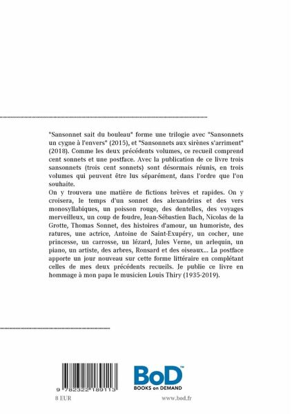 On y trouvera une matière de fictions brèves et rapides: sources ou torrents destinés à nourrir le fleuve plus nourri d'oeuvres de fictions à venir. Chacun de ces sonnets peut-être lu séparément. Ils peuvent aussi être lu ensemble. Chacun d'entre eux est un concentré qui peut faire naître une oeuvre plus développée: nouvelle, roman et même roman-fleuve. Chacun peut aussi être lu pour lui-même. On y croisera, le temps d'un sonnet des alexandrins et des vers monosyllabiques, un poissons rouge, des dentelles, des voyages merveilleux, un coup de foudre, Jean-Sébastien Bach, Nicolas de la Grotte, Thomas Sonnet, des histoires d'amour, un humoriste, des ratures, une actrice, Antoine de Saint-Exupéry, un cocher, une princesse, un carrosse, un lézard, Jules Verne, un arlequin, un piano, un artiste, des arbres, Ronsard et des oiseaux (et bien d'autres personnages encore). On y lira des histoires absurdes ou étonnantes, mystérieuses, reposantes, étranges ou classiques, invraisemblables ou vraisemblables, rythmées, imagées, lumineuses ou sombres et énigmatiques... À chacun d'explorer ce livre selon son bon plaisir pour y découvrir des sens nouveaux, inattendus, merveilleux ou rêveurs en parcourant les proliférantes ressources des sonnets, en les lisant et en les relisant. La postface apporte un jour nouveau sur cette forme littéraire en complétant celles de mes deux précédents recueils. Je publie ce livre en hommage à mon papa le musicien Louis Thiry (1935-2019).