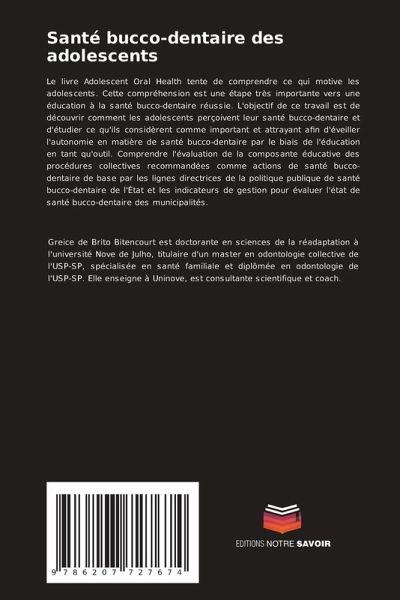 Le livre Adolescent Oral Health tente de comprendre ce qui motive les adolescents. Cette compréhension est une étape très importante vers une éducation à la santé bucco-dentaire réussie. L'objectif de ce travail est de découvrir comment les adolescents perçoivent leur santé bucco-dentaire et d'étudier ce qu'ils considèrent comme important et attrayant afin d'éveiller l'autonomie en matière de santé bucco-dentaire par le biais de l'éducation en tant qu'outil. Comprendre l'évaluation de la composante éducative des procédures collectives recommandées comme actions de santé bucco-dentaire de base par les lignes directrices de la politique publique de santé bucco-dentaire de l'État et les indicateurs de gestion pour évaluer l'état de santé bucco-dentaire des municipalités.