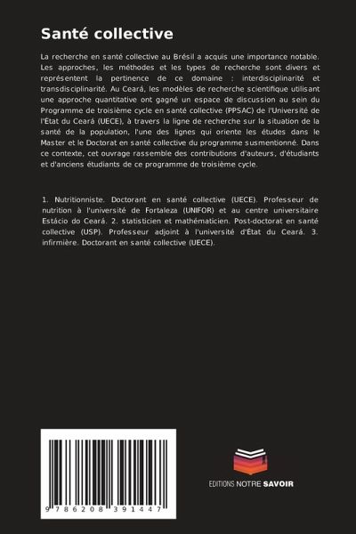 La recherche en santé collective au Brésil a acquis une importance notable. Les approches, les méthodes et les types de recherche sont divers et représentent la pertinence de ce domaine : interdisciplinarité et transdisciplinarité. Au Ceará, les modèles de recherche scientifique utilisant une approche quantitative ont gagné un espace de discussion au sein du Programme de troisième cycle en santé collective (PPSAC) de l'Université de l'État du Ceará (UECE), à travers la ligne de recherche sur la situation de la santé de la population, l'une des lignes qui oriente les études dans le Master et le Doctorat en santé collective du programme susmentionné. Dans ce contexte, cet ouvrage rassemble des contributions d'auteurs, d'étudiants et d'anciens étudiants de ce programme de troisième cycle.