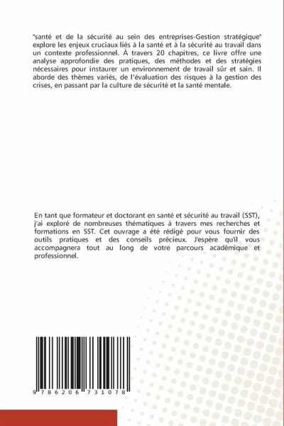 "santé et de la sécurité au sein des entreprises-Gestion stratégique" explore les enjeux cruciaux liés à la santé et à la sécurité au travail dans un contexte professionnel. À travers 20 chapitres, ce livre offre une analyse approfondie des pratiques, des méthodes et des stratégies nécessaires pour instaurer un environnement de travail sûr et sain. Il aborde des thèmes variés, de l'évaluation des risques à la gestion des crises, en passant par la culture de sécurité et la santé mentale.