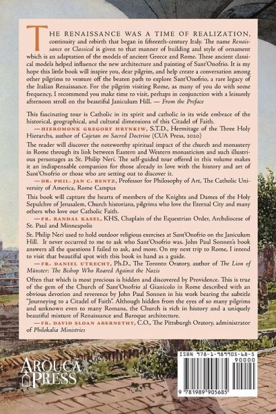 The Renaissance was a time of realization, continuity and rebirth that began in fifteenth-century Italy. The name Renaissance or Classical is given to that manner of building and style of ornament which is an adaptation of the models of ancient Greece and Rome. These ancient classical models helped influence the new architecture and painting of Sant'Onofrio. It is my hope this little book will inspire you, dear pilgrim, and help create a conversation among other pilgrims to venture off the beaten path to explore Sant'Onofrio, a rare legacy of the Italian Renaissance. For the pilgrim visiting Rome, as many of you do with some frequency, I recommend you make time to visit, perhaps in conjunction with a leisurely afternoon stroll on the beautiful Janiculum Hill. - From the Preface