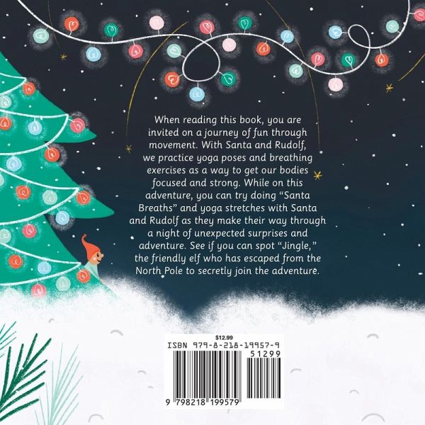 When reading this book, you are invited on a journey of fun through movement. With Santa and Rudolf, we practice yoga poses and breathing exercises as a way to get our bodies focused and strong. While on this adventure, you can try doing "Santa Breaths" and yoga stretches with Santa and Rudolf as they make their way through a night of unexpected surprises and adventure. See if you can spot "Jingle," the friendly elf who has escaped from the North Pole to secretly join the adventure.