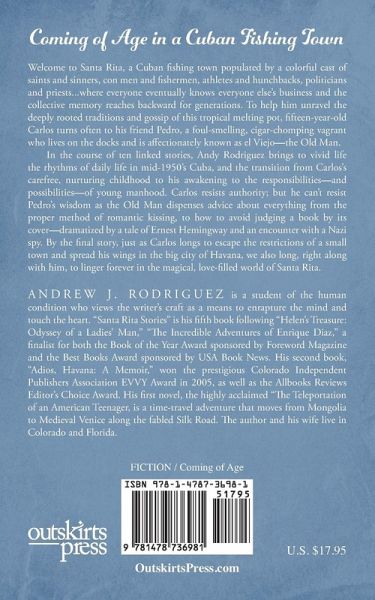 Welcome to Santa Rita, a Cuban fishing town populated by a colorful cast of saints and sinners, con men and fishermen, athletes and hunchbacks, politicians and priests...where everyone eventually knows everyone else's business and the collective memory reaches backward for generations. To help him unravel the deeply rooted traditions and gossip of this tropical melting pot, fifteen-year-old Carlos turns often to his friend Pedro, a foul-smelling, cigar-chomping vagrant who lives on the docks and is affectionately known as el Viejo-the Old Man. In the course of ten linked stories, Andy Rodriguez brings to vivid life the rhythms of daily life in mid-1950's Cuba, and the transition from Carlos's carefree, nurturing childhood to his awakening to the responsibilities-and possibilities-of young manhood. Carlos resists authority; but he can't resist Pedro's wisdom as the Old Man dispenses advice about everything from the proper method of romantic kissing, to how to avoid judging a book by its cover-dramatized by a tale of Ernest Hemingway and an encounter with a Nazi spy. By the final story, just as Carlos longs to escape the restrictions of a small town and spread his wings in the big city of Havana, we also long, right along with him, to linger forever in the magical, love-filled world of Santa Rita. In the course of ten linked stories, Andy Rodriguez brings to life the rhythms of daily life in mid-1950s Cuba, and the transition from Carlos's carefree, nurturing childhood to his awakening to the responsibilities--and possibilities--of young manhood. Carlos resists authority; but he can't resist Pedro's wisdom as the Old Man dispenses advice about everything from the proper method of romantic kissing, to how to avoid judging a book by its cover--dramatized by a tale of Ernest Hemingway and an encounter with a Nazi spy. By the final story, just as Carlos longs to escape the restrictions of a small town and spread his wings in the big city of Havana, we al