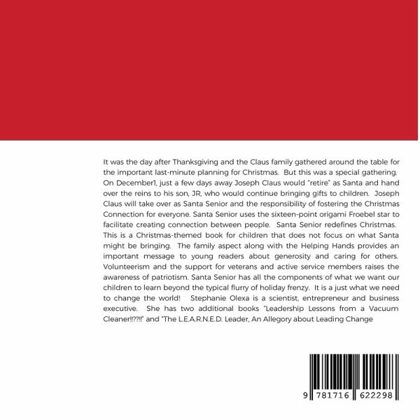 It was the day after Thanksgiving and the Claus family gathered around the table for the important last minute planning for Christmas. But this was a special gathering. On December 1, just a few days away, Joseph Claus would "retire" as Santa and hand over the reins to his son, JR, who would continue bringing gifts to children. Joseph Claus will take over as Santa Senior with the responsibility of fostering the Christmas Connection for everyone. Santa Senior uses the sixteen point origami Froebel star to facilitate creating connection between people. Santa Senior redefines Christmas! This is a Christmas-themed book for children that does not focus on what Santa might be bringing. The family aspect along with the Helping Hands provides an important message to young readers about generosity and caring for others. Volunteerism and the support for veterans and active service members raises the awareness of patriotism. Santa Senior has all the components of what we want our children to learn beyond the typical flurry of holiday frenzy. It is just what we need to change the world!