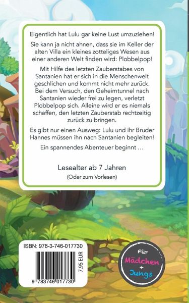 Eigentlich hat Lulu gar keine Lust umzuziehen. Sie kann ja nicht ahnen, dass sie im Keller der alten Villa ein kleines zotteliges Wesen aus einer anderen Welt finden wird: Plobbelpop! Mit Hilfe des letzten Zauberstabes von Santanien hat er sich in die Menschenwelt geschlichen und kommt nicht mehr zurück. Bei dem Versuch, den Geheimtunnel nach Santanien wieder freizulegen, verletzt Plobbelpop sich. Alleine wird er es niemals schaffen, den letzten Zauberstab rechtzeitig zurück zu bringen. Es gibt nur einen Ausweg: Lulu und ihr Bruder Hannes müssen ihn nach Santanien begleiten!Ein spannendes Abenteuer beginnt ...Lesealter ab 8 Jahren (Oder zum Vorlesen)
