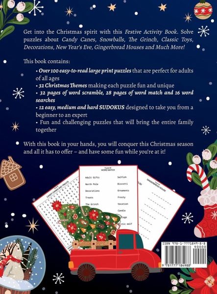 Get into the Christmas spirit with this Festive Activity Book. Solve puzzles about Candy Canes, Snowballs, The Grinch, Classic Toys, Decorations, New Year's Eve, Gingerbread Houses and Much More! You will get: Over 100 easy-to-read large print puzzles that are perfect for adults of all ages 32 Christmas Themes making each puzzle fun and unique 32 pages of word scramble, 28 pages of word match and 16 word searches 12 easy, medium and hard SUDOKUS designed to take you from a beginner to an expert Fun and challenging puzzles that will bring the entire family together With this book in your hands, you will conquer this Christmas season and all it has to offer - and have some fun while you're at it!