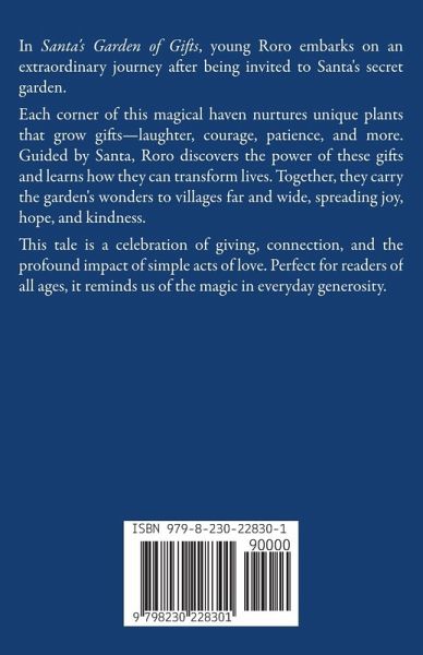 In Santa's Garden of Gifts, young Roro embarks on an extraordinary journey after being invited to Santa's secret garden. Each corner of this magical haven nurtures unique plants that grow gifts-laughter, courage, patience, and more. Guided by Santa, Roro discovers the power of these gifts and learns how they can transform lives. Together, they carry the garden's wonders to villages far and wide, spreading joy, hope, and kindness. This tale is a celebration of giving, connection, and the profound impact of simple acts of love. Perfect for readers of all ages, it reminds us of the magic in everyday generosity.
