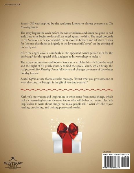 Santa's Gift was inspired by the sculpture known to almost everyone as The Kneeling Santa. The story begins the week before the winter holiday, and Santa has gone to bed early. Just as he begins to doze off, an angel appears to him. The angel proceeds to tell Santa of a very special child that is about to be born and asks him to look for "the star that shines as brightly as the love in a child's eyes" on the evening of his yearly ride. After the angel leaves as suddenly as she appeared, Santa gets an idea for the perfect gift for this special child and goes to his workshop to make it. The story continues on and follows Santa as he explains his visit from the angel and the night of his yearly journey to find the special child, which brings the sculpture of The Kneeling Santa full circle and changes the name of the winter holiday forever. Santa's Gift is a story that relates the message, "It isn't what you give someone or what the cost; the best gift is the gift of love and yourself."
