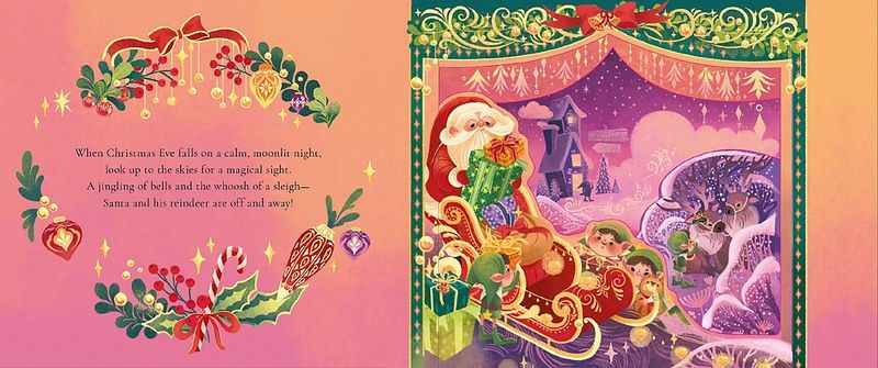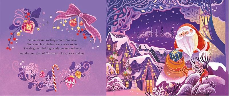 Every year Santa makes his magical journey on his sleigh, piling his sleigh high with shiny wrapped gifts for kids across the world. Follow him and his reindeer into the sky, and soar over the mountains, lakes, and trees, discovering the beauty below and the spreading Christmas cheer.