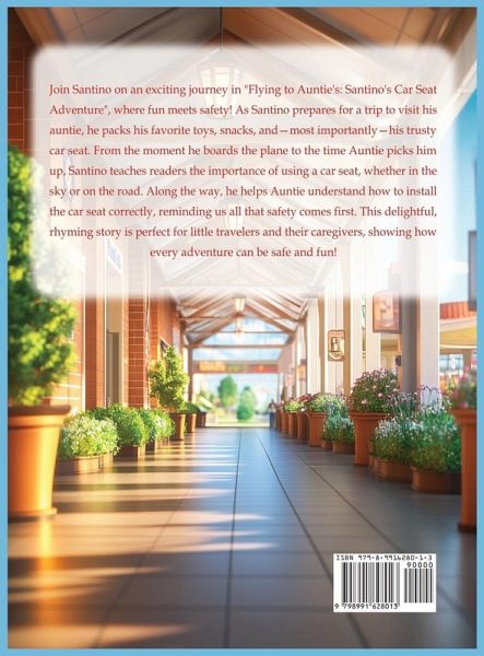 Join Santino on an exciting journey in "Flying to Auntie's: Santino's Car Seat Adventure", where fun meets safety! As Santino prepares for a trip to visit his auntie, he packs his favorite toys, snacks, and-most importantly-his trusty car seat. From the moment he boards the plane to the time Auntie picks him up, Santino teaches readers the importance of using a car seat, whether in the sky or on the road. Along the way, he helps Auntie understand how to install the car seat correctly, reminding us all that safety comes first. This delightful, rhyming story is perfect for little travelers and their caregivers, showing how every adventure can be safe and fun!Join Santino on an exciting journey in "Flying to Auntie's: Santino's Car Seat Adventure", where fun meets safety! As Santino prepares for a trip to visit his auntie, he packs his favorite toys, snacks, and-most importantly-his trusty car seat. From the moment he boards the plane to the time Auntie picks him up, Santino teaches readers the importance of using a car seat, whether in the sky or on the road. Along the way, he helps Auntie understand how to install the car seat correctly, reminding us all that safety comes first. This delightful, rhyming story is perfect for little travelers and their caregivers, showing how every adventure can be safe and fun!