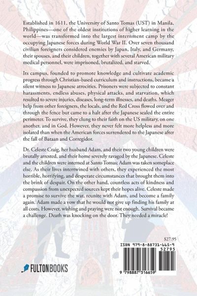 Established in 1611, the University of Santo Tomas (UST) in Manila, Philippines--one of the oldest institutions of higher learning in the world--was transformed into the largest internment camp by the occupying Japanese forces during World War II. Over seven thousand civilian foreigners considered enemies by Japan, Italy, and Germany, their spouses, and their children, together with several American military medical personnel, were imprisoned, brutalized, and starved. Its campus, founded to promote knowledge and cultivate academic progress through Christian-based curriculum and instructions, became a silent witness to Japanese atrocities. Prisoners were subjected to constant harassments, endless abuses, physical attacks, and starvation, which resulted to severe injuries, diseases, long-term illnesses, and deaths. Meager help from other foreigners, the locals, and the Red Cross flowed over and through the fence but came to a halt after the Japanese sealed the entire perimeter. To survive, they clung to their faith on the US military, on one another, and in God. However, they never felt more helpless and more isolated than when the American forces surrendered to the Japanese after the fall of Bataan and Corregidor. Dr. Celeste Craig, her husband Adam, and their two young children were brutally arrested, and their home severely ravaged by the Japanese. Celeste and the children were interned at Santo Tomas; Adam was taken someplace else. As their lives intertwined with others, they experienced the most horrible, horrifying, and desperate circumstances that brought them into the brink of despair. On the other hand, countless acts of kindness and compassion from unexpected sources kept their hopes alive. Celeste made a promise to survive the war, reunite with Adam, and become a family again. Adam made a vow that he would not give up finding his family at all costs. However, wishing and praying were not enough. Survival became a challenge. Death was knocking on the door. They needed a miracle!