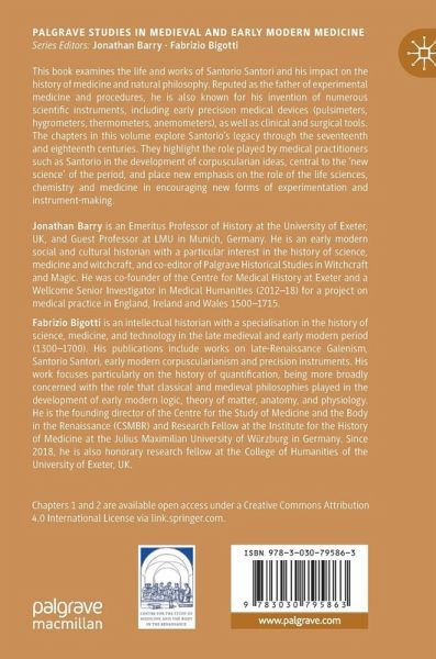 This book examines the life and works of Santorio Santori and his impact on the history of medicine and natural philosophy. Reputed as the father of experimental medicine and procedures, he is also known for his invention of numerous scientific instruments, including early precision medical devices (pulsimeters, hygrometers, thermometers, anemometers), as well as clinical and surgical tools. The chapters in this volume explore Santorio's legacy through the seventeenth and eighteenth centuries. They highlight the role played by medical practitioners such as Santorio in the development of corpuscularian ideas, central to the 'new science' of the period, and place new emphasis on the role of the life sciences, chemistry and medicine in encouraging new forms of experimentation and instrument-making.