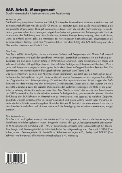 Dieses Buch informiert über die technischen Besonderheiten der SAP-Systeme und gibt Hinweise darauf, welche Konsequenzen sich ergeben hinsichtlich der Organisation und Arbeitsgestaltung im Unternehmen. Es erläutert die organisatorischen Auswirkungen von SAP-Software vor dem Hintergrund der technischen Grundkonzepte. Dabei geht es den Autoren um eine bewußte Gestaltung auch der sozialen Dimensionen der Systemanwendungen, ausgehend von klar formulierten Leitbildern der Arbeitsgestaltung. Als Hilfe für die praktische Umsetzung von Leitbildern stellen die Verfasser unter dem Titel "Stellschrauben" die technischen Ansatzpunkte der SAP-Systeme dar, die für arbeitsorientierte Technikgestaltung genutzt werden können. Bezüglich des Einführungsprojekts wird dargestellt, zu welchem Zeitpunkt, anläßlich welcher Arbeitsschritte im Vorgehensmodell und durch welche Stellen oder Personen arbeitsorientierte Inhalte sinnvoll eingebracht werden können. Dabei wird auch ausführlich auf die zu beachtenden Vorschriften und Normen sowie auf die Beteiligung der Arbeitnehmervertretung eingegangen.USP: SAP-Technologie erfolgreich einführen