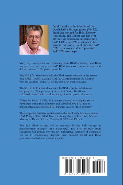 Within this book 16 BPM/SAP experts (authors) have applied the 16 BPM areas of the SAP BPM framework within their company. The companies that have contributed to this book are: CSM, Philips, DSM, KLM, Dutch Railways, Bavaria, Tata Steel, Achmea, Ministry of Dutch Defense, Kuwait Oil, SAP and ERIKS. Many large companies are re-defining their BPM(S) strategy and BPM / ALM roadmap and are using the SAP BPM framework to define their own BPM project portfolio. The SAP BPM framework links the BPM maturity models in the market (like EFQM, OMG and Gartner) with the available (non) SAP tooling and BPM methodologies. The SAP BPM Framework contains 16 BPM areas, for which most company have 16 separate project portfolio's with 16 different stakeholders. The BPM strategy of SAP will be explained by Ann Rosenberg. The Capgemini BPM manager will explain why the key competitive capability of companies will be to continuously improve their business model and BPM governance to find new revenue streams.