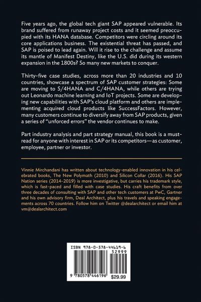 Five years ago, the global tech giant SAP appeared vulnerable. Its brand suffered from runaway project costs and it seemed preoccupied with its HANA database. Competitors were circling around its core applications business. This volume catalogs a significant, on-going turnaround. The existential threat has passed, and SAP is poised to lead again. Will it rise to the challenge and assume its mantle of Manifest Destiny, like the U.S. did during its western expansion in the 1800s? So many new markets to conquer. Thirty-five case studies, across more than 20 industries and 10 countries, showcase a spectrum of SAP customer strategies: Some are moving to S/4HANA and C/4HANA, while others are trying out Leonardo machine learning and IoT projects. Some are developing new capabilities with SAP's cloud platform and others are implementing acquired cloud products like SuccessFactors. However, many customers continue to diversify away from SAP products, given a series of "unforced errors" the vendor continues to make. Part industry analysis and part strategy manual, this book is a must-read for anyone with interest in SAP or its competitors—as customer, employee, partner or investor.