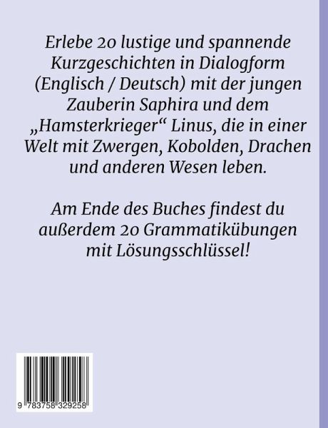 Erlebe 20 lustige und spannende Kurzgeschichten in Dialogform (Englisch-Deutsch) mit der jungen Zauberin Saphira und dem >>Hamsterkrieger<< Linus, die in einer Welt mit Zwergen, Kobolden, Drachen und anderen Wesen leben. Am Ende des Buches findest du außerdem 20 Grammatikübungen mit Lösungsschlüssel! Das Sprachniveau orientiert sich an A2/B1 des Gemeinsamen Europäischen Referenzrahmens. 2. verbesserte Auflage