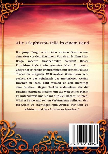 Alle 3 Saphirrot-Teile in einem BandDer junge Dasgo rettet einen kleinen Drachen aus dem Meer vor dem Ertrinken.Von da an ist ihm klar: Dasgo möchte Drachenreiter werden!Dieser Entschluss ändert sein gesamtes Leben. Ab diesem Zeitpunkt erkundet er zusammen mit seinem Freund Tropas die magische Welt Aratras.Gemeinsam versuchen sie, das Geheimnis der mysteriösen weißen Drachen zu lösen.Bald müssen sie sich allerdings dem finsteren Magier Trokon widersetzen, der die Drachen benutzen möchte, um die Welt seiner Macht zu unterwerfen und sie ins dunkle Chaos zu stürzen.Wird es Dasgo und seinen Verbündeten gelingen, den Bösewicht zu bezwingen und Aratras vor ihm zu schützen und den Frieden zu bewahren?