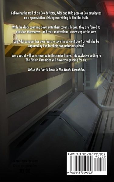 Following the trail of an Evo defector, Addi and Mila pose as Evo employees on a spacestation, risking everything to find the truth. With the clock counting down until their cover is blown, they are forced to question themselves - and their motivations - every step of the way. Can Addi conquer her own fears to save the Ancient One? Or will she be captured by Evo for their own nefarious plans? Every secret will be uncovered in this series finale. This explosive ending to The Biokin Chronicles will have you gasping for air. This is the fourth book in The Biokin Chronicles.