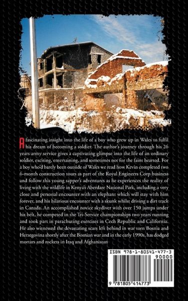 A fascinating insight into the life of a boy who grew up in Wales to fulfil his dream of becoming a soldier. The author's journey through his 26 years army service gives a captivating glimpse into the life of an ordinary soldier, exciting, entertaining, and sometimes not for the faint hearted. For a boy who'd barely been outside of Wales we read how Kevin completed two 6-month construction tours as part of the Royal Engineers Corp business and follow this young sapper's adventures as he experiences the reality of living with the wildlife in Kenya's Aberdare National Park, including a very close and personal encounter with an elephant which will stay with him forever, and his hilarious encounter with a skunk whilst driving a dirt track in Canada. An accomplished novice skydiver with over 150 jumps under his belt, he competed in the Tri-Service championships two years running and took part in parachuting exercises in Cech Republic and California. He also witnessed the devastating scars left behind in war torn Bosnia and Herzegovina shortly after the Bosnian war and in the early 1990s, has dodged mortars and rockets in Iraq and Afghanistan.