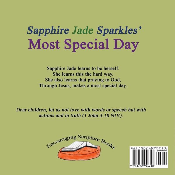 This is the second of the "Encouraging Scripture Books" series. Sapphire Jade Sparkles tries to be something she's not. She learns the hard way that being yourself is the only way to be. It includes a most special day for her figuring this out. This children's book written in verse form, helps explain the verse 1 John 3:18, "Dear children, let us not love with words or speech but with actions and in truth." It will be fun for you and your child to explore the meaning of this verse and look for any of the familiar characters from book one of this series, The Rowdy Sisters.