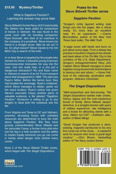 Steve Stilwell's former Navy JAG Corps buddy Ric Stokes has been jailed for possession of heroin in Vietnam. He was found in the same room with his traveling companion Ryan Eversall, who died of an overdose in the company of a prostitute. Steve knows his friend is a straight arrow. Was he set up? If so, for what reason? Steve travels to Ho Chi Minh City in search of the truth. In no time Steve is targeted by the people who framed his friend. A beautiful young American businesswoman insinuates her way into the case. Can she really help, or is she just a dangerous distraction? Ric and Ryan came to Vietnam in search of an Air Force transport plane that disappeared in 1968. The pilot was Ryan's father. Before the heroin bust, they had located the wreckage. Ryan's notebook, which Steve manages to obtain, spells out the exact location. Ryan's widow has given Steve's associate Casey another piece of valuable evidence, a file labeled "Sapphire Pavilion." Someone is willing to go to any lengths to steal both the notebook and the file. From Virginia and Texas to DC and Vietnam, powerful, all-seeing forces with unlimited resources are determined to bury the truth about Sapphire Pavilion. But they have grossly underestimated Steve Stilwell and his associate Casey, a former Army pilot who lost her leg in a helo accident. And the ability to inspire loyalty wherever you go can come in handy when danger lurks behind every corner. Book 2 of the Steve Stilwell Thriller series, which began with The Siegel Dispositions.