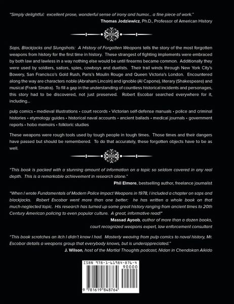 Saps, Blackjacks and Slungshots: A History of Forgotten Weapons discovers and preserves the story of the most forgotten weapons from history for the first time in history. These unique fighting tools were feared for centuries and embraced equally by the law and the lawless like nothing else had been or would be until firearms became commonly available. They are best remembered, when at all, for being favored by real life muggers and fictional private detectives. They were however also used by police, soldiers, sailors, spies, cowboys and duelists in various times and countries. Following their trail takes the reader from New York City’s infamous Bowery to the San Francisco Gold Rush, Paris’s Moulin Rouge to Georgian era London and beyond. Encountered along the way is a cast of characters from the noble (Abraham Lincoln) to the ignoble (Al Capone), the literary (Shakespeare) to the musical (Frank Sinatra). For centuries they were an essential part of any tough guy’s arsenal, the last vestige of this portrayed in classic noir films and books. Despite all this, their tale remained untold until now. Robert Escobar had never found a subject with less available information. Looking to correct this, he searched everywhere imaginable for their fading footprints, including…pulp comics - medieval illustrations - court records - Victorian self-defense manuals - police and criminal histories - etymology guides - historical naval accounts - newspaper stories - ancient ballads - medical journals - government reports - archeological excavations - hobo memoirs - folkloric studies - interviews conducted by the author. Fortunately the sum of it all doesn’t just fill a gap in the understanding of countless historical incidents and personages, it entertains. Saps, blackjacks and slungshots were rough tools used by tough people in tough times. Those times and their dangers have passed but should be accurately remembered. To do that, these strange weapons have to be as well.