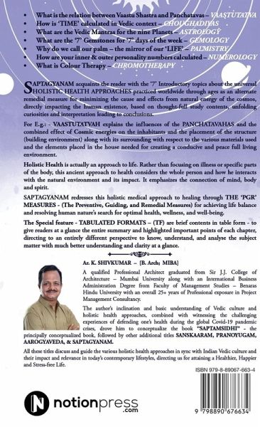 SAPTAGYANAM acquaints the reader with the '7' Introductory topics about the universal HOLISTIC HEALTH APPROACHES practiced worldwide through ages as an alternate remedial measure for minimizing the cause and effects from natural energy of the cosmos, directly impacting the human existence, based on thought-full study contents, unfolding curiosities and interpretation leading to conclusions. For E.g.: - VAASTUTATVAH explains the influences of the PANCHATAVAHAS and the combined effect of Cosmic energies on the inhabitants and the placement of the structure (building environment) along with its surrounding with respect to the various materials used and the elements placed in the house needed for creating a conducive and peace full living environment. Holistic Health is actually an approach to life. Rather than focusing on illness or specific parts of the body, this ancient approach to health considers the whole person and how he interacts with the natural environment and its impact. It emphasizes the connection of mind, body and spirit. SAPTAGYANAM redresses this holistic medical approach to healing through THE 'PGR' MEASURES - (The Preventive, Guiding, and Remedial Measures) for achieving life balance and resolving human nature's search for optimal health, wellness, and well-being. The Special feature - TABULATED FORMATS - (TF) are brief contents in table form - to give readers at a glance the entire summary and highlighted important points of each chapter, directing to an entirely different perspective to know, understand, and analyse the subject matter with much better understanding and clarity at a glance.