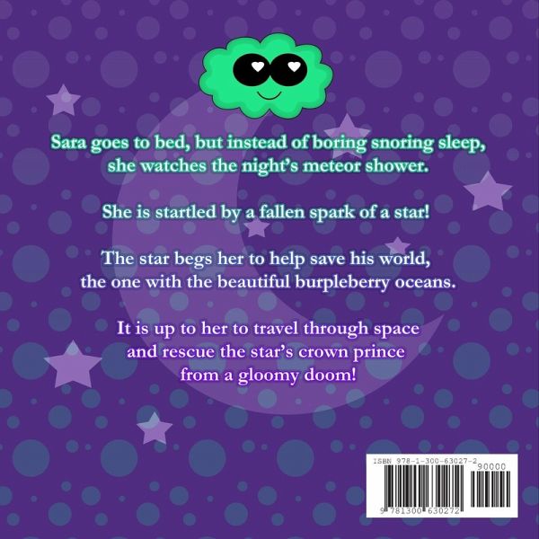 Sara goes to bed, but instead of boring snoring sleep, she watches the night's meteor shower. She is startled by a fallen spark of a star! The star begs her to help save his world, the one with the beautiful burpleberry oceans. It is up to her to travel through space and rescue the star's crown prince from a gloomy doom!