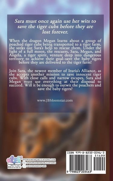 Sara must once again use her wits to save the tiger cubs before they are lost forever. When the dragon Megan learns about a group of poached tiger cubs being transported to a tiger farm, she seeks out Sara's help to rescue them. Under the light of a full moon, the rescuers, Sara, Megan, and Angela, a tiger spirit, venture deep into dangerous territory to achieve their goal-save the baby tigers before they are delivered to the tiger farm! Join Sara, the newest member of Ituria's Alliance, as she accepts another mission to save innocent tiger cubs. With close calls and narrow escapes, Sara and Megan must use everything at their disposal to succeed. Will it be enough to outwit the poachers and save the baby tigers?