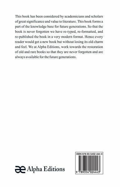 This book has been considered by academicians and scholars of great significance and value to literature. This book forms a part of the knowledge base for future generations. So that the book is never forgotten we have re-typed, re-formatted, and re-published the book in a very modern format. Hence every reader would get a new book but without losing its old charm and feel. We at Alpha Editions, work towards the restoration of old and rare books so that they are never forgotten and are always available for the future generations.