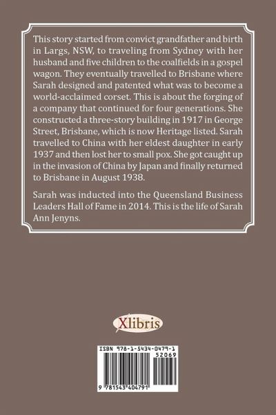 This story started from convict grandfather and birth in Largs, NSW, to traveling from Sydney with her husband and five children to the coalfields in a gospel wagon. They eventually traveled to Brisbane and designed and patented what was to become a world-acclaimed corset. This is about the forging of a company that continued for four generations. They constructed a three-story building in 1917 in George Street, Brisbane, which is now Heritage listed. She traveled to China with her eldest daughter in early 1937 and then lost her to small pox. She got caught up in the invasion of China by Japan and finally returned to Brisbane in August 1938. Sarah was inducted into the Queensland Business Leaders Hall of Fame in 2014. This is the life of Sarah Ann Jenyns.