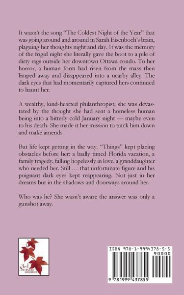 It wasn't the song "The Coldest Night of the Year" that was going around and around in Sarah Eisenboch's brain, plaguing her thoughts night and day. It was the memory of the frigid night she literally gave the boot to a pile of dirty rags outside her downtown Ottawa condo. To her horror, a human form had risen from the mass then limped away and disappeared into a nearby alley. The dark eyes that had momentarily captured hers continued to haunt her. A wealthy, kind-hearted philanthropist, she was devastated by the thought she had sent a homeless human being into a bitterly cold January night - maybe even to his death. She made it her mission to track him down and make amends. But life kept getting in the way. "Things" kept placing obstacles before her: a badly timed Florida vacation, a family tragedy, falling hopelessly in love, a granddaughter who needed her. Still ... that unfortunate figure and his poignant dark eyes kept reappearing. Not just in her dreams but in the shadows and doorways around her. Who was he? She wasn't aware the answer was only a gunshot away.