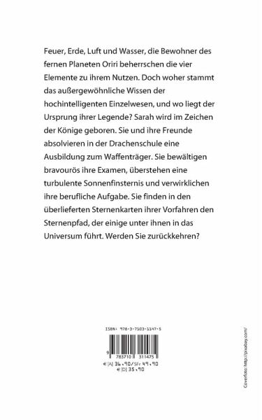 Feuer, Erde, Luft und Wasser, die Bewohner des fernen Planeten Oriri beherrschen die vier Elemente zu ihrem Nutzen. Doch woher stammt das außergewöhnliche Wissen der hochintelligenten Einzelwesen, und wo liegt der Ursprung ihrer Legende? Sarah wird im Zeichen der Könige geboren. Sie und ihre Freunde absolvieren in der Drachenschule eine Ausbildung zum Waffenträger. Sie bewältigen bravourös ihre Examen, überstehen eine turbulente Sonnenfinsternis und verwirklichen ihre berufliche Aufgabe. Sie finden in den überlieferten Sternenkarten ihrer Vorfahren den Sternenpfad, der einige unter ihnen in das Universum führt. Werden Sie zurückkehren?