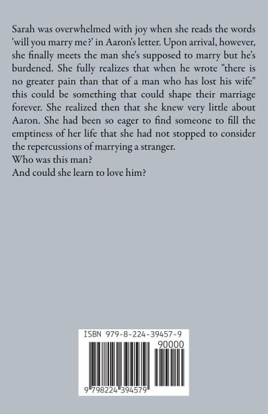 Sarah was overwhelmed with joy when she reads the words 'will you marry me?' in Aaron's letter. Upon arrival, however, she finally meets the man she's supposed to marry but he's burdened. She fully realizes that when he wrote "there is no greater pain than that of a man who has lost his wife" this could be something that could shape their marriage forever. She realized then that she knew very little about Aaron. She had been so eager to find someone to fill the emptiness of her life that she had not stopped to consider the repercussions of marrying a stranger. Who was this man? And could she learn to love him?