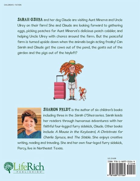 Sarah O'Shea and her dog Claude are visiting Aunt Minerva and Uncle Ulrey on their farm! She and Claude are looking forward to gathering eggs, picking peaches for Aunt Minerva's delicious peach cobbler, and helping Uncle Ulrey with chores around the farm. But the peaceful farm is turned upside down when the animals begin acting freaky! Can Sarah and Claude get the cows out of the pond, the goats out of the garden and the pigs out of the hayloft?
