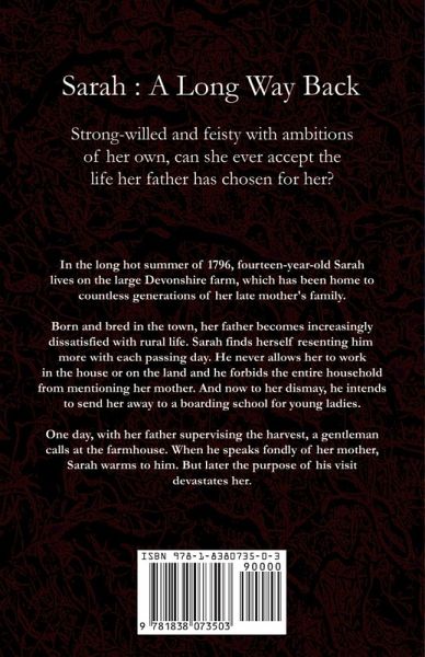 It is the long hot summer of 1796. In Devonshire, fourteen-year-old Sarah lives on the large farm, which has been home to countless generations of her late mother's family. Her father is a strict head of his household and workforce. Born and bred in a Somersetshire town, he clearly has no love for his rural home and lifestyle. Although often privately resentful of his rules, Sarah, along with everyone else, knows she must do as she is told. Throughout her childhood, she has quietly accepted that no one is ever allowed to mention her mother. In addition she has always managed to hide her frustration at being prevented from working in the farmhouse or out on the land. But now to her utter dismay, she has learned her father intends to send her away to a boarding school for young ladies. This is the final straw for Sarah and she finds herself becoming increasingly rebellious. One day, with her father supervising the harvest, a gentleman calls at the farmhouse. When he speaks fondly of her mother, Sarah warms to him. But later the purpose of his visit devastates her. ¿¿¿¿¿¿¿This book can be enjoyed as a stand-alone novel but it also serves as the first instalment of the four-part series A Long Way Back.
