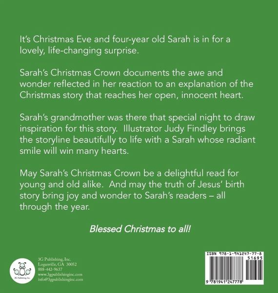 It’s Christmas Eve and four-year old Sarah is in for a lovely, life-changing surprise. Sarah’s Christmas Crown documents the awe and wonder reflected in her reaction to an explanation of the Christmas story that reaches her open, innocent heart. Sarah’s grandmother was there that special night to draw inspiration for this story. Illustrator Judy Findley brings the storyline beautifully to life with a Sarah whose radiant smile will win many hearts. May Sarah’s Christmas Crown be a delightful read for young and old alike. And may the truth of Jesus’ birth story bring joy and wonder to Sarah’s readers – all through the year.