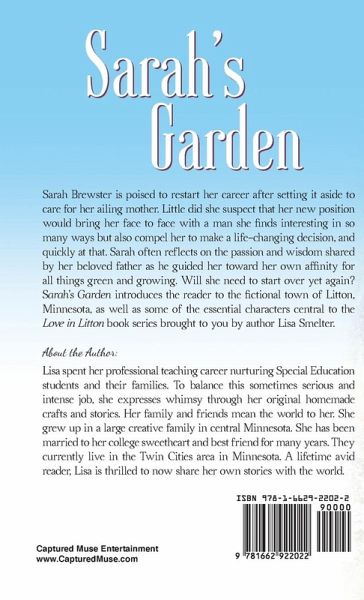 Sarah Brewster is poised to restart her career after setting it aside to care for her ailing mother. Little did she suspect that her new position would bring her face to face with a man she finds interesting in so many ways, but also compel her to make a life-changing decision, and quickly at that. Sarah often reflects on the passion and wisdom shared by her beloved father as he guided her toward her own affinity for all things green and growing. Will she need to start over yet again? "Sarah's Garden" introduces the reader to the fictional town of Litton, Minnesota, as well as some of the essential characters central to the Love in Litton book series brought to you by author Lisa Smelter.