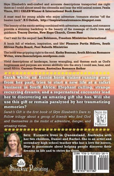 Sarah's Gift is the first book of Skye Elizabeth's Dare to Follow trilogy about a group of friends who find God and themselves in the midst of adventure, danger, and amazing vistas. Sarah White, an Aussie horse trainer running away from her past, tries to start a new life at a safari business in South Africa. Elephant culling, strange recurring dreams, and a supernatural encounter lead her to discovering an amazing gift she has. Will she use this gift or remain paralyzed by her traumatizing memories?