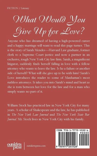 Anyone who has dreamed of having a high-powered career and a happy marriage will want to read this page turner. This is the story of Sarah Mendes-Harvard Law graduate, former clerk to a Supreme Court justice and now a partner in an exclusive, tough New York City law firm. Sarah, a magnificent litigator, suddenly finds herself falling in love with a fellow attorney who wants to leave the law. Is he a failure or another side of herself? What will she give up to be with him? Sarah's Love introduces the reader to some of Manhattan's most ruthless attorneys. It takes you into Sarah's mind and heart as she is torn between her love for the law and for a man who simply wants no part of it.