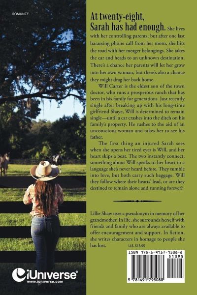 At twenty-eight, Sarah has had enough. She lives with her controlling parents, but after one last harassing phone call from her mom, she hits the road with her meager belongings. She takes the car and heads to an unknown destination. There's a chance her parents will let her grow into her own woman, but there's also a chance they might drag her back home. Will Carter is the eldest son of the town doctor, who runs a prosperous ranch that has been in his family for generations. Just recently single after breaking up with his long-time girlfriend Shaye, Will is determined to remain single-until a car crashes into the ditch on his family's property. He rushes to the aid of an unconscious woman and takes her to see his father. The first thing an injured Sarah sees when she opens her tired eyes is Will, and her heart skips a beat. The two instantly connect; something about Will speaks to her heart in a language she's never heard before. They tumble into love, but both carry such baggage. Will they follow where their hearts' lead, or are they destined to remain alone and running forever?