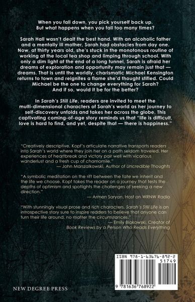 When you fall down, you pick yourself back up. But what happens when you fall too many times? Sarah Hall wasn't dealt the best hand. With an alcoholic father and a mentally ill mother, Sarah had obstacles from day one. Now, at thirty years old, she's stuck in the monotonous routine of working at the local tea shop and limping through school. With only a dim light at the end of a long tunnel, Sarah is afraid her dreams of exploration and opportunity may remain just that - dreams. That is until the worldly, charismatic Michael Kensington returns to town and reignites a flame she'd thought stifled. Could Michael be the one to change everything for Sarah? And if so, would it be for the better? In Sarah's Still Life, readers are invited to meet the multi-dimensional characters of Sarah's world as her journey to self-discovery unfolds and takes her across the globe. This captivating coming-of-age story reminds us that "life is difficult, love is hard to find, and yet, despite that - there is happiness."