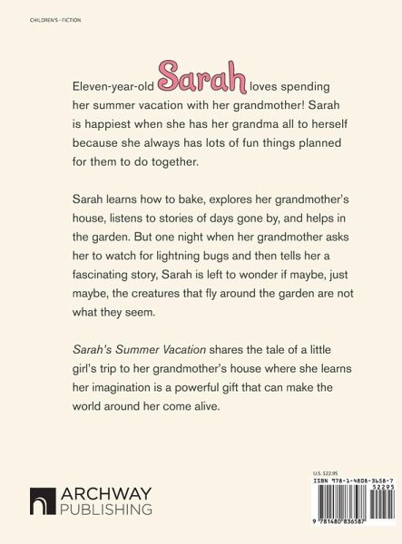 Eleven-year-old Sarah loves spending her summer vacation with her grandmother! Sarah is happiest when she has her grandma all to herself because she always has lots of fun things planned for them to do together. Sarah learns how to bake, explores her grandmother's house, listens to stories of days gone by, and helps in the garden. But one night when her grandmother asks her to watch for lightning bugs and then tells her a fascinating story, Sarah is left to wonder if maybe, just maybe, the creatures that fly around the garden are not what they seem. Sarah's Summer Vacation shares the tale of a little girl's trip to her grandmother's house where she learns her imagination is a powerful gift that can make the world around her come alive.