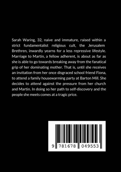 Sarah Waring, 32, naive and immature, raised within a strict fundamentalist religious cult, the Jerusalem Brethren, inwardly yearns for a less repressive lifestyle. Marriage to Martin, a fellow adherent, is about as far as she is able to go towards breaking away from the fanatical grip of her dominating mother. That is, until she receives an invitation from her once disgraced school friend Fiona, to attend a family housewarming party at Barton Mill. She decides to attend against the pressure from her church and Martin. In doing so her path to self-discovery and the people she meets comes at a tragic price.
