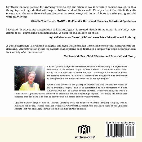 Cynthia's life long passion for knowing what to say and when to say it certainly comes through in this thought-provoking tale that will inspire children and adults as well. Finally, a book that fits both audiences and at the same time awakens the potential we all carry within us. A book to assist young and old with daily living. Claudia Von Kielich, MAOM - Co-Founder Horizontal Harmony Behavioral Specialists I loved it! It caused my imagination to kick into gear. It created visuals in my mind. It is a truly wonderful book-engrossing and memorable. A book for the child in all of us. AgnesTalamantez Carroll, ATC and Associates Education and Training A gentle approach to profound thoughts and deep truths broken into simple terms that children can understand. An instruction guide for parents that explains deep truths in a simple way and reinforces them in a variety of circumstances. Marianne Mullen, Child Educator and International Nanny