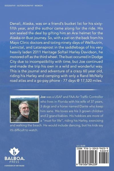 Denali, Alaska, was on a friend’s bucket list for his sixty-fifth year, and the author came along for the ride. His son sealed the deal by gifting him an Arai helmet for the Alaska-or-Bust journey. So, with a pat on the back from his Mayo Clinic doctors and toting ninety days of Wellbutrin, Lamictal, and Latanaprost in the saddlebags of his very heavily laden 2011 Heritage Softail Harley Davidson, he motored off as the third wheel. The bust occurred in Dodge City due to incompatibility with time, but Joe continued and made the trip his own in a wild and wonderful way. This is the journal and adventure of a crazy 60 year old, riding his Harley and camping with only a Rand McNally road atlas and a go-pay phone - 77 days @ 17,520 miles.