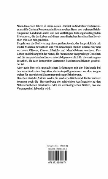 Erzählung mit autobiographischen Elementen über den Start in ein neues Leben, in und mit der Natur, Erfahrungen und Erlebnisse mit den Menschen und der Kultur auf Sardinien, mit unvergesslichen Exkursionen ins Landesinnere, wo es nicht nur zahlreiche archäologische Sehenswürdigkeiten zu bestaunen gibt sondern auch eine Vielfalt an kulinarischen Genüssen auf den Besucher wartet. Es ist ein Buch, das spannend und unterhaltsam zugleich ist und den Leser mitnimmt und für diese Insel begeistert, auch wenn es nicht ohne Hürden und Probleme geht.