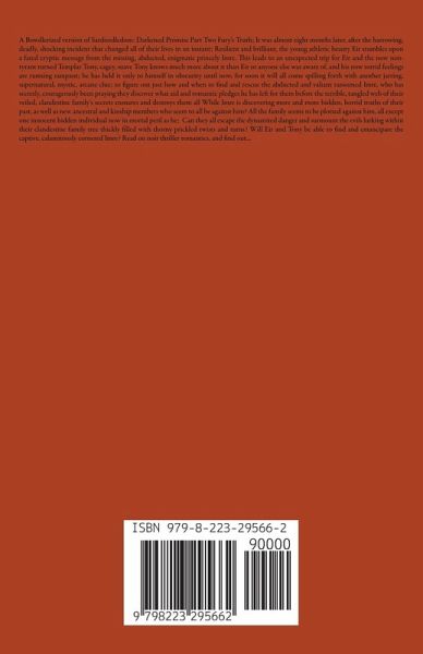 A Bowdlerized, cleaner version of Sardoodledom: Darkened Promise Part Two Fury's Truth; It was almost eight months later, after the harrowing, deadly, shocking incident that changed all of their lives in an instant; Resilient and brilliant, the young athletic beauty Eir stumbles upon a fated cryptic message from the missing, abducted, enigmatic princely Imre. This leads to an unexpected trip for Eir and the now non-tyrant turned Templar Tony, cagey, suave Tony knows much more about it than Eir or anyone else was aware of, and his now torrid feelings are running rampant; he has held it only to himself in obscurity until now, for soon it will all come spilling forth with another jarring, supernatural, mystic, arcane clue; to figure out just how and when to find and rescue the abducted and valiant ransomed Imre, who has secretly, courageously been praying they discover what aid and romantic pledges he has left for them before the terrible, tangled web of their veiled, clandestine family's secrets ensnares and destroys them all While Imre is discovering more and more hidden, horrid truths of their past, as well as new ancestral and kinship members who seem to all be against him? All the family seems to be plotted against him, all except one innocent hidden individual now in mortal peril as he; Can they all escape the dynamited danger and surmount the evils lurking within their clandestine family tree thickly filled with thorny prickled twists and turns? Will Eir and Tony be able to find and emancipate the captive, calamitously cornered Imre? Read on noir thriller romantics, and find out...