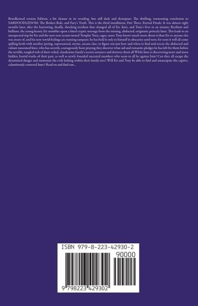 Bowdlerized version Edition, cleaner but still dark and dystopian: The thrilling, tormenting conclusion to SARDOODLEDOM: The Broken Rule, and Fury's Truth. This is the third installment, Part Three, Eternal Finale; It was almost eight months later, after the harrowing, deadly, shocking incident that changed all of Eir, Imre, and Tony's lives in an instant; Resilient and brilliant, the young beauty Eir stumbles upon a fated cryptic message from the missing, abducted, enigmatic princely Imre. This leads to an unexpected trip for Eir and the now non-tyrant turned Templar Tony, cagey, suave Tony knows much more about it than Eir or anyone else was aware of, and his now torrid feelings are running rampant; he has held it only to himself in obscurity until now, for soon it will all come spilling forth with another jarring, supernatural, mystic, arcane clue; to figure out just how and when to find and rescue the abducted and valiant ransomed Imre, who has secretly, courageously been praying they discover what aid and romantic pledges he has left for them before the terrible, tangled web of their veiled, clandestine family's secrets ensnares and destroys them all While Imre is discovering more and more hidden, horrid truths of their past, as well as newly founded ancestral members who seem to all be against him? Can they all free themselves from the dynamited danger and surmount the evils lurking within their clandestine family tree? Will Eir and Tony be able to find and emancipate the captive, calamitously cornered Imre? Read on and find out...