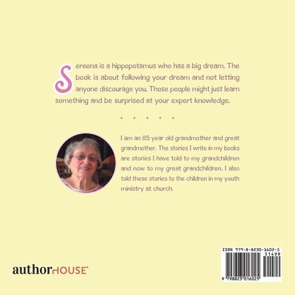 Sereena is a hippopotamus who has a big dream. The book is about following your dream and not letting anyone discourage you. Those people might just learn something and be surprised at your expert knowledge.